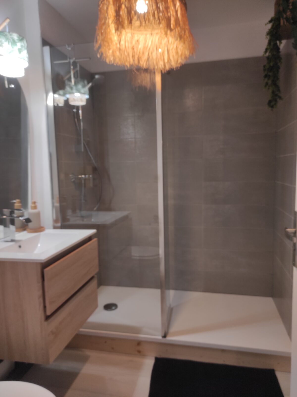 Une salle d’eau, avec douche à l’italienne, WC et lavabo.