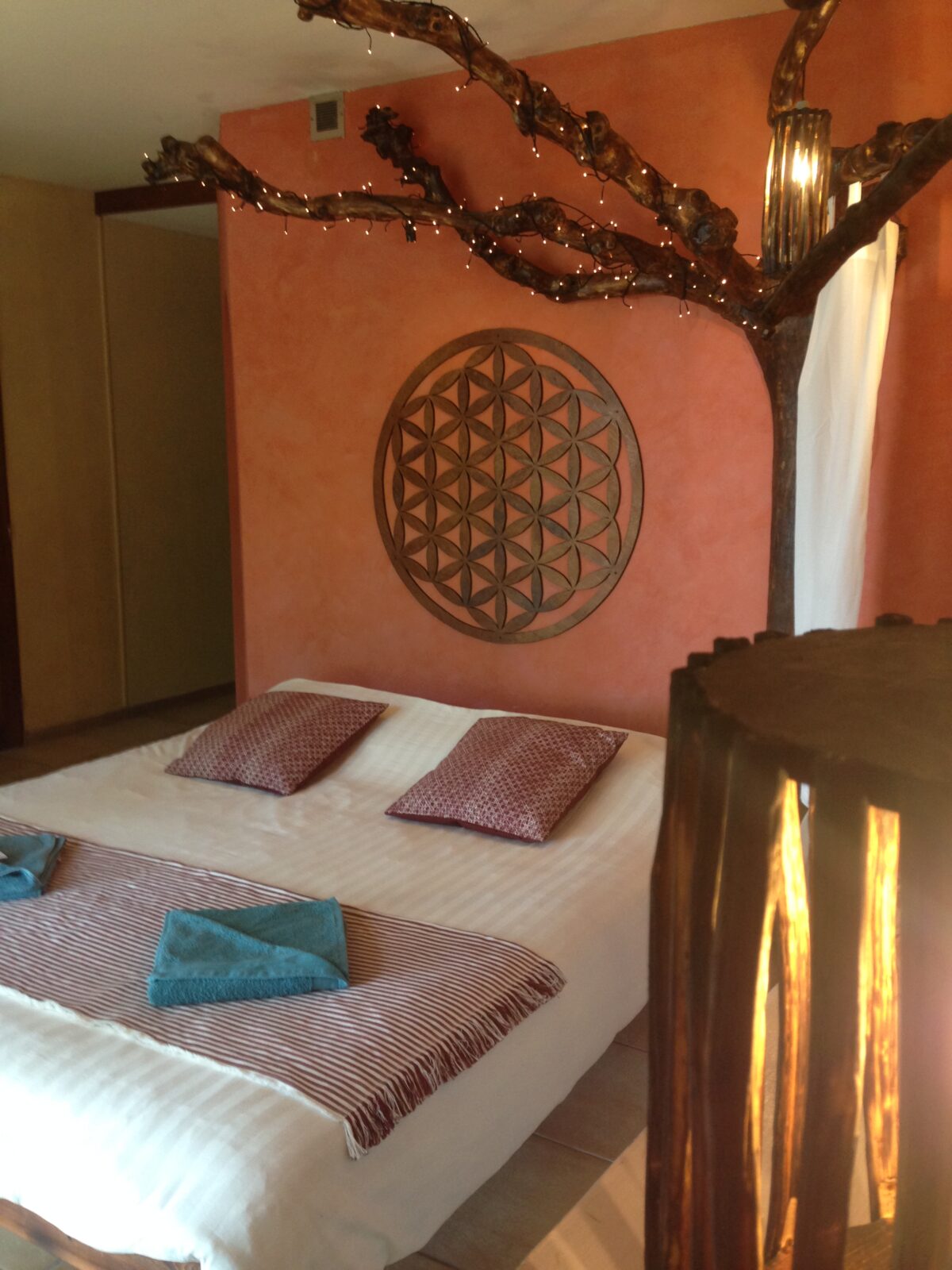 La chambre « Flower of Life » est la plus grande chambre que nous ayons, avec un grand lit double (180×200) et un lit superposé (2x 90×200). Max 4 personnes. Elle dispose d’une grande salle de bain, d’un dressing et d’une terrasse avec une vue magnifique sur la vallée.